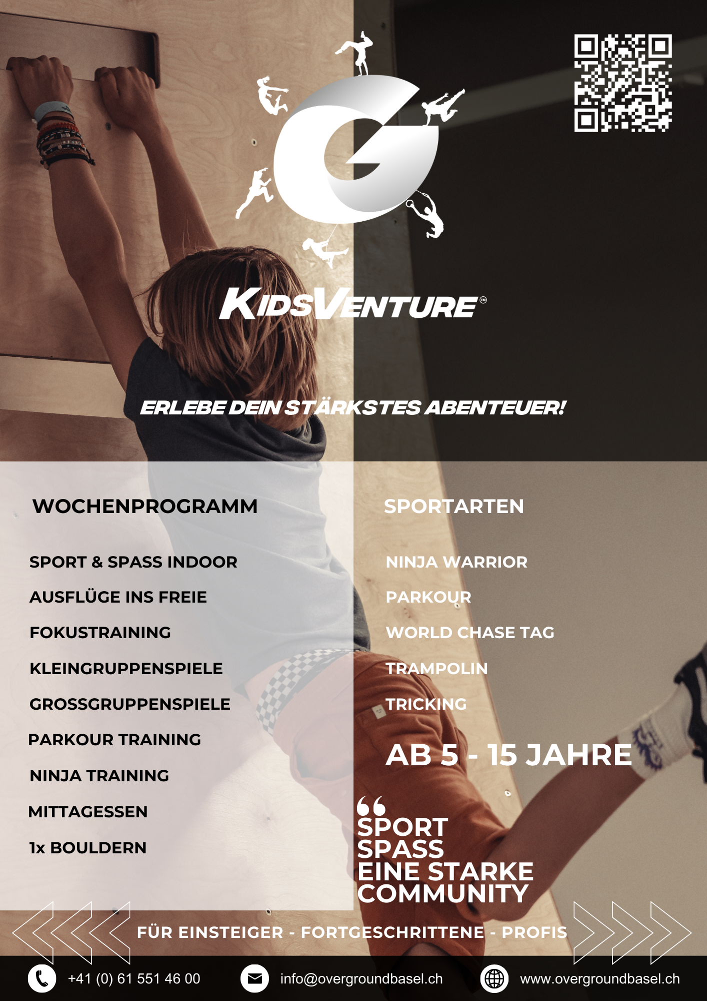 - Das KidsVenture Camp bietet für Kinder zwischen 5 und 15 Jahren ein unvergessliches Sportabenteuer. Ob Anfänger oder Profi, ob Sport- oder Spielbegeistert, für alle ist das passende dabei! Das Campkonzept ist als Ganztagscamp ausgerichtet und beinhaltet eine gute Mischung aus Sport, Training, Spiel und Spass. Es besteht auch die Möglichkeit nur vormittags oder nur nachmittags am Camp teilzunehmen. Der inhaltliche Fokus richtet sich nach den Interessen der Kinder. Es besteht für alle die Möglichkeit selbst mitzuentscheiden, wie sportlich aktiv, spielerisch oder kreativ das Camp sein soll. Unser Wochenprogramm beinhaltet: - Die Sportarten Ninja Warrior, Parkour, World Chase Tag, Trampolin, Airbag, Tricking - Grossgruppenspiele wie Spion, Piratenschiff oder Animalialand - Erlebnis- und Storytelling Spiele - Fokustraining mit Flips, Mutproben und vieles mehr - Kreative Angebote - Ausflüge ins Freie