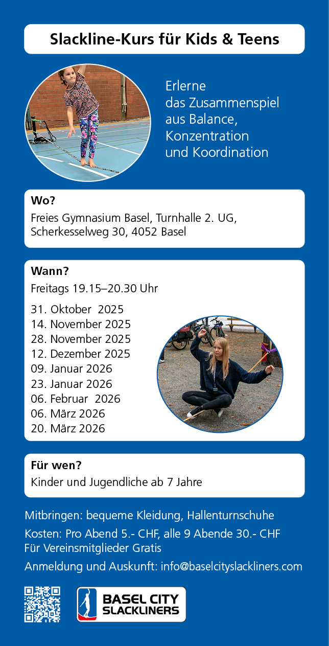 - Hast du Lust, etwas Neues auszuprobieren? Die Basel City Slackliners laden Kinder und Jugendliche ab 7 Jahren zu einem Slackline-Kurs ein! Lerne spielerisch das Balancieren auf der Slackline, verbessere dein Körpergefühl und hab einfach Spass in der Gruppe. Der Kurs findet über den ganzen Winter an neun Terminen statt. Ob Anfänger*in oder schon erfahren – alle sind willkommen!