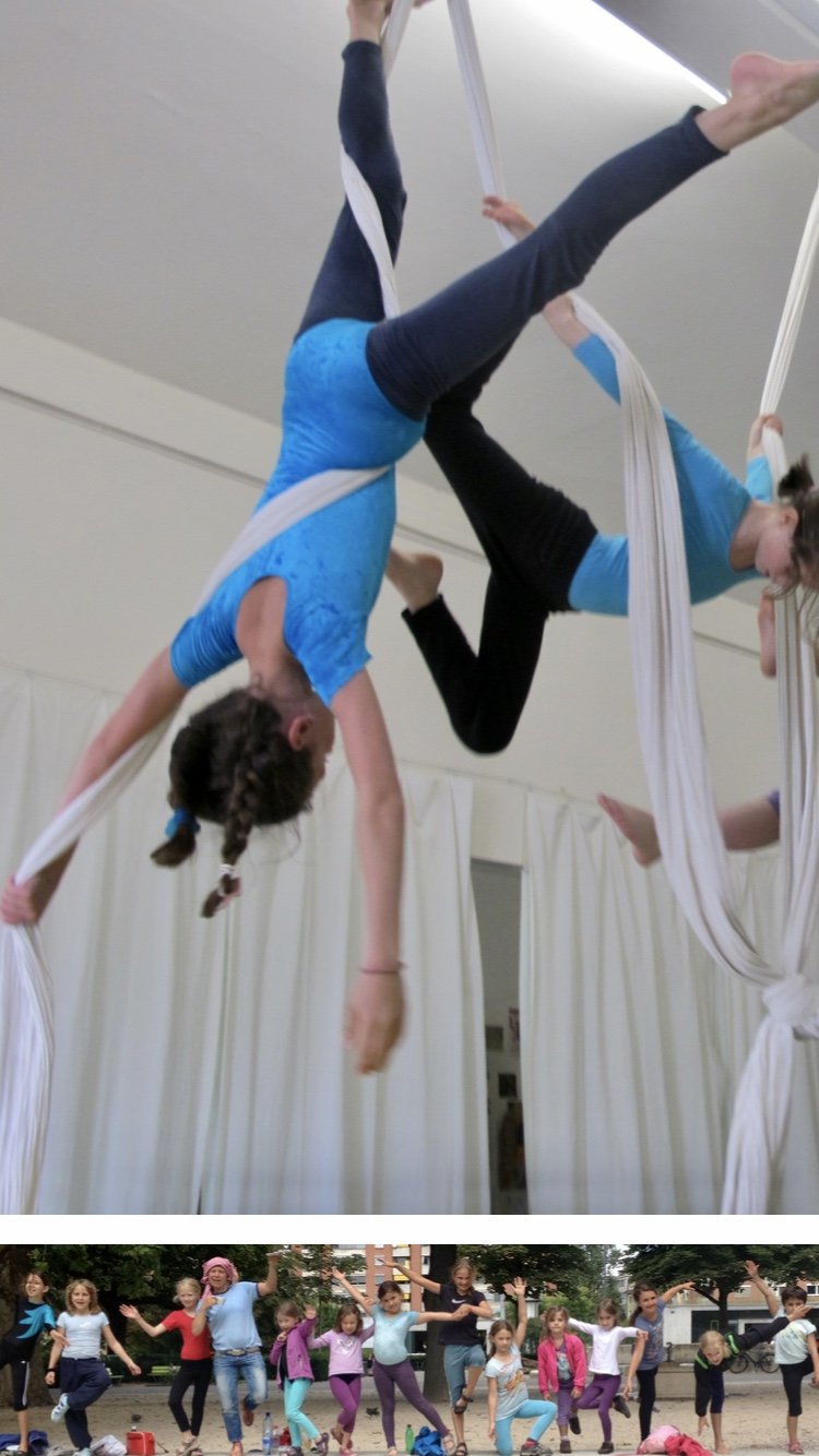 - Einführung und Vertiefung der Kunststücke, am Trapez und Vertikaltuch wie auch akrobatischen & tänzerisch Elementen der Bodenakrobatik. Mit einer Abschlussaufführung.