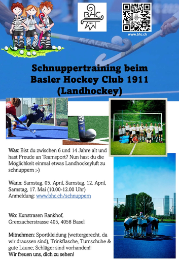 Schnuppertraining beim Basler Hockey Club 1911 (Landhockey)Bist du zwischen 6 und 14 Jahre alt und hast Freude an Teamsport? Nun hast du die Möglichkeit einmal etwas Landhockeyluft zu schnuppern