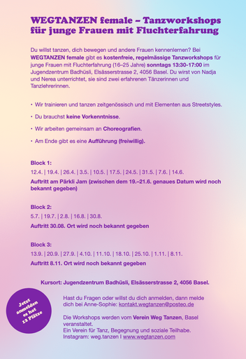 WEGTANZEN femaleWEGTANZEN female ist eine kostenfreie Tanzworkshopreihe für junge Frauen (16–25 Jahre) mit Fluchterfahrung in Basel.